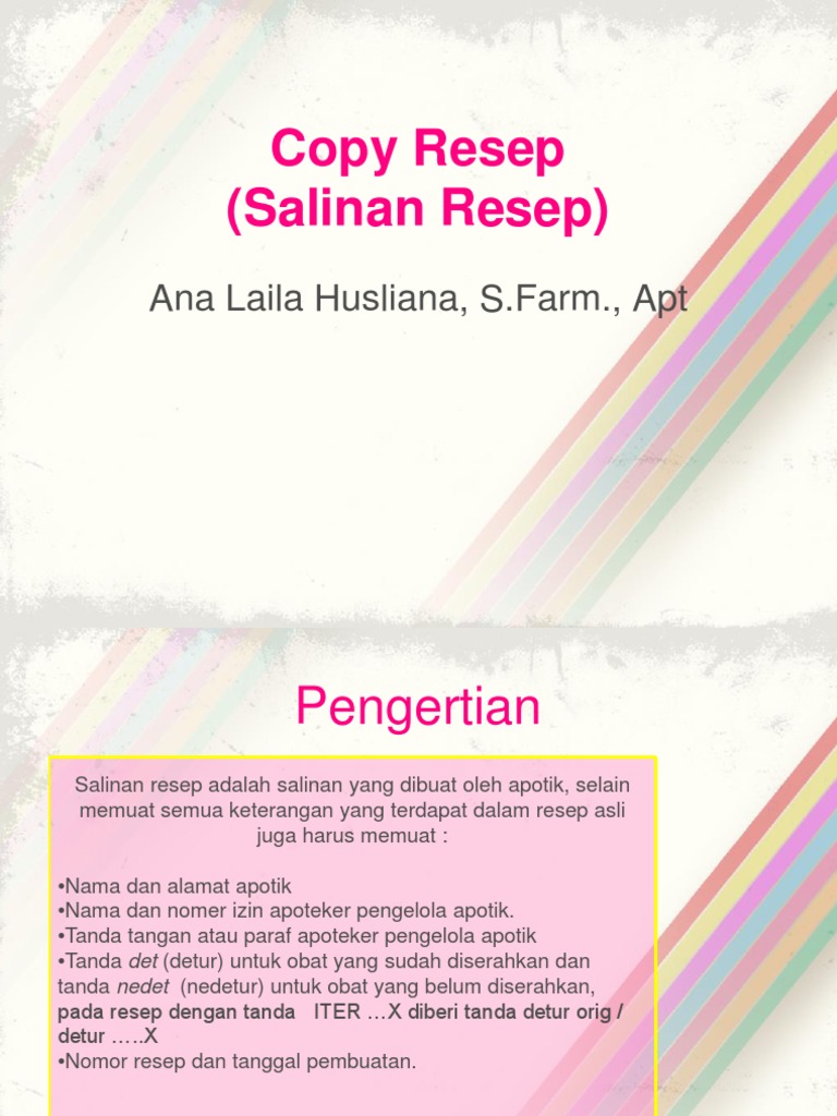 S semel d d cap i det orig. Resep dan salinan resep dwi endarti sf msc apt. Lab manajemen farmasi dan farmasi masyarakat bagian farmasetika fakultas farmasi ugm 061816 1 definisi resep resep adalah permintaan tertulis kepada apoteker pengelola apotek apa untuk menyediakan dan menyerahkan obat bagi penderita dari dokter dokter gigi atau dokter hewan yang diberi izin berdasarkan peraturan perundang undangan.