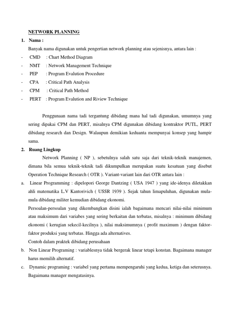 Berdasarkan latar belakang masalah maka perlu dilakukan penelitian dengan judul analisis network planning dengan cpm critical path methode dalam rangka efisiensi waktu dan biaya proyek pembangunan jalan segitiga ujung batu studi kasus pada cv. Network planning merupakan sebuah alat manajemen yang memungkinkan dapat lebih luas dan lengkapnya perencanaan dan pengawasan suatu proyek. Contoh soal network planning.