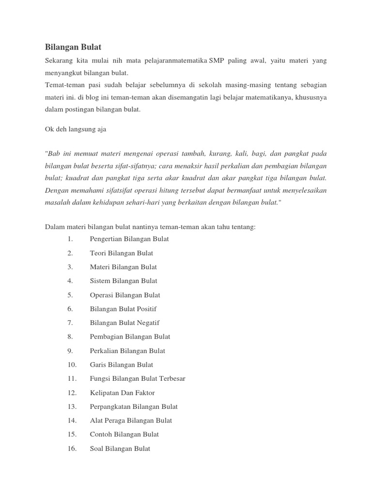Contoh soal bilangan bulat positif dan negatif kelas 7. Sehingga anggota bilangan bulat adalah bilangan bulat postif nol dan bilangan bulat negatif. Materi matematika smp tentang bilangan bulat yaitu mengurutkan bilangan bulat penjumlahan dan pengurangan bilangan bulat sifat sifat bilangan bulat invers dan contoh soalnya. Bilangan bulat terdiri dari bilangan bulat negatif nol dan bilangan bulat positif.